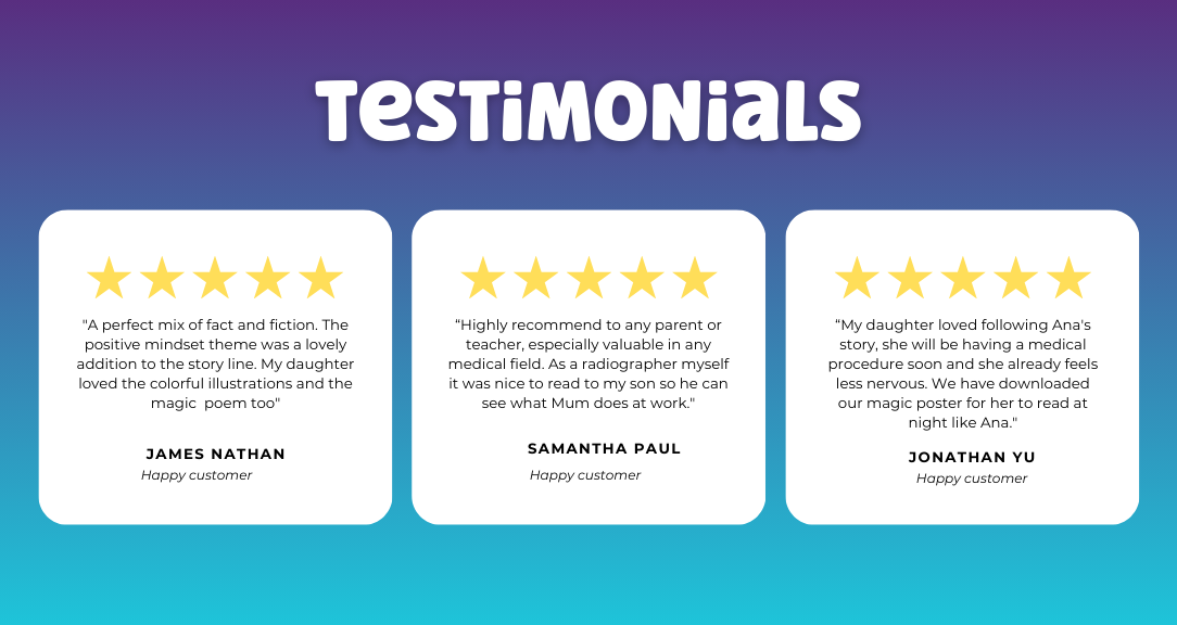 Parents and medical professionals highly recommend our books for their effective mix of fact and fiction, highlighted by positive mindset themes. Children find comfort in our stories, reducing anxiety about medical procedures and other unfamiliar scenarios. The supportive resources are being used in classrooms, homes and medical waiting rooms